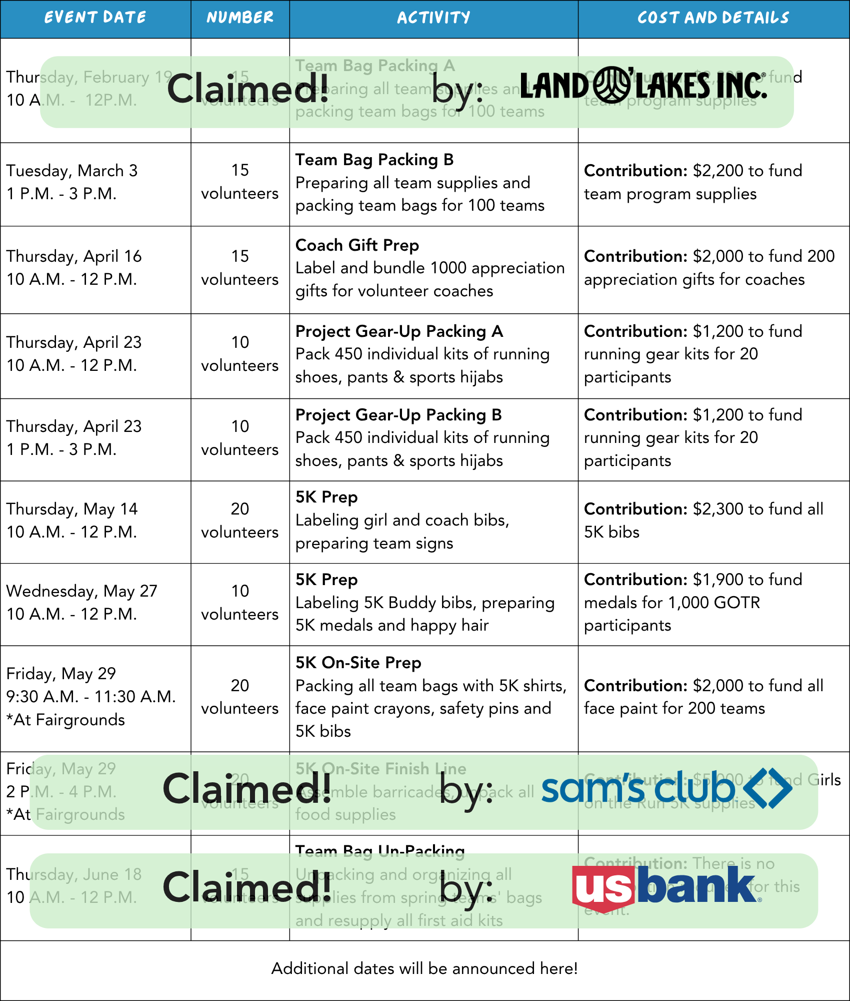 This vital work is fueled by the volunteer and financial support of local partners. Each date listed below includes the cost associated with the project. These opportunities are first-come, first-serve so as soon as you know which date(s) you’d like, please click the Claim a Date button or contact Johnna Bratt, Operations Manager, at johnna.bratt@girlsontherun.org to complete a group volunteer agreement.