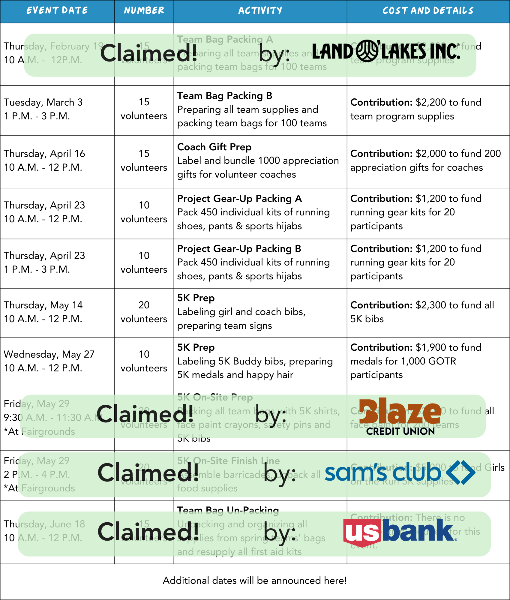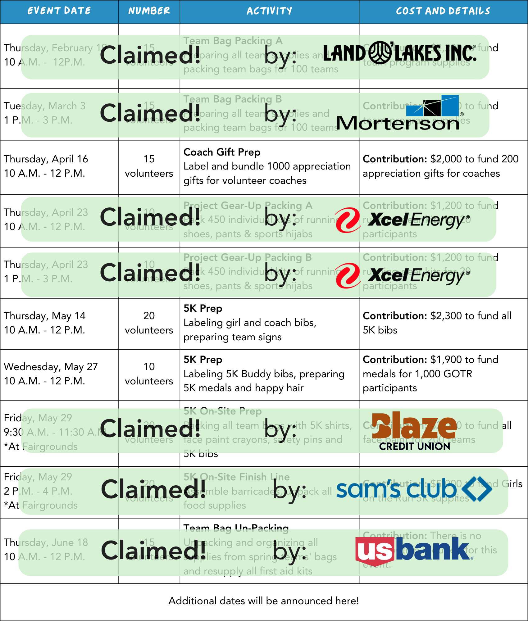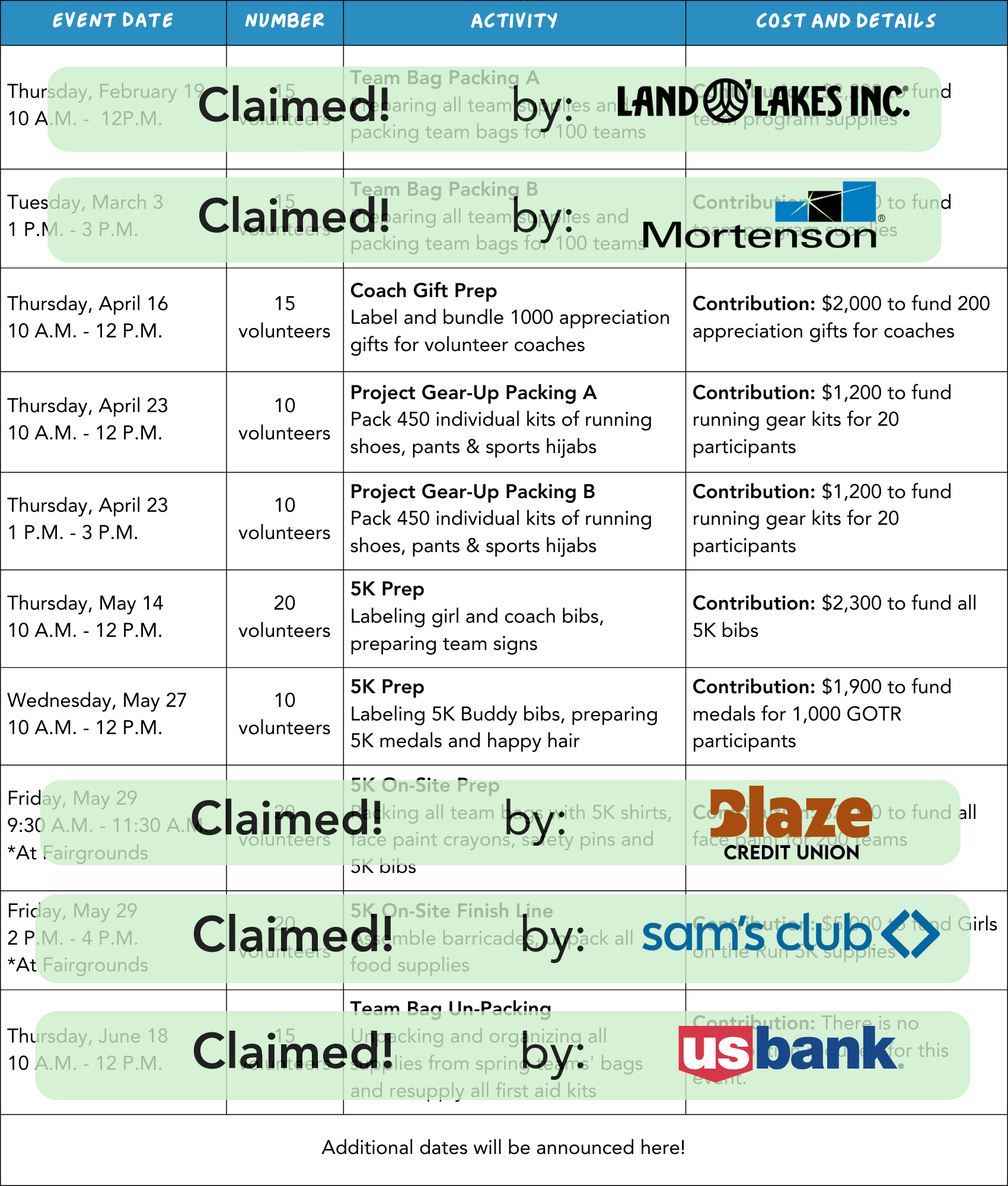 Contributions to Girls on the Run Minnesota are tax deductible to the fullest extent of the law. Exact project dates and times may be flexible. Can't find a date that works for your group? Please enquire with us at johnna@gotrmn.org.